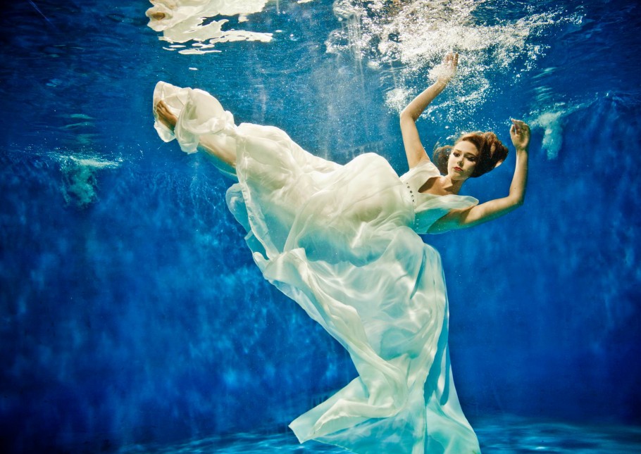 如果想营造出梦幻的效果,水中很难避免的就是发生大量气泡。有气泡发生就没问题,但如果喜爱清晰度高的废品,就得防止发生气泡,因此要在事前与新人做好沟通,知道他想要拍摄的效果。
